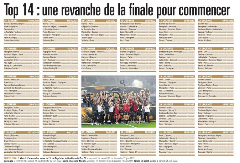 TOP 14 Ce jeudi après-midi le calendrier complet de la saison 20212022 est tombé. Le calendrier complet de la saison 2021-2022. Antoine Dupont et le Stade Toulousain connaissent leur menu lors des doublons de la saison 2021-2022.